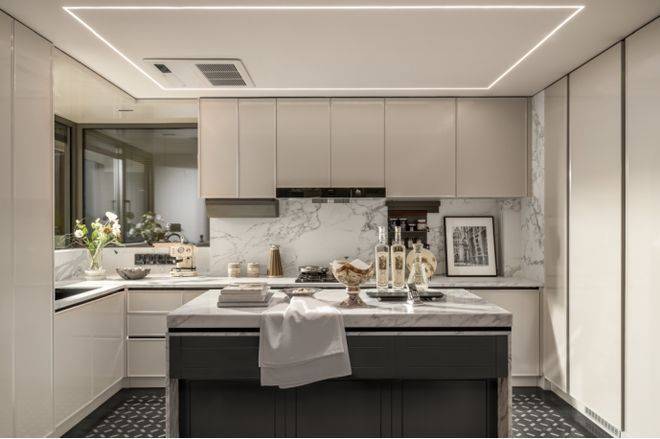超大尺度的中西岛台,既符合中式烹饪的实用逻辑(预留足够操作台面),又能承载西式社交(朋友小聚时在岛台品酒聊天),让厨房从“单一做饭空间”变成“生活场景发生器”。