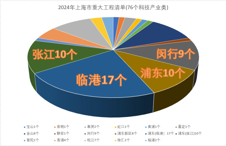 据统计,在2024年上海市公布的76项科创产业类项目中,有35个分布在浦东新区,其中临港17个,张江10个。临港超越张江,成为上海市重大工程分布最为集中的区域。
