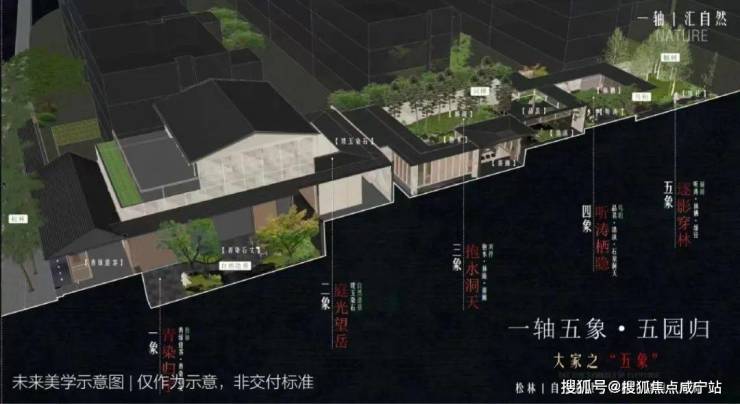 东方奢雅立体五感庭院:1轴+5园+6 巷+12景,打造东方避世、都市静居、与自然共栖的生活道场。