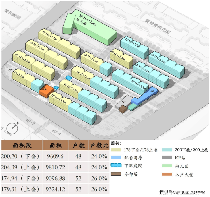 该地块拟建设13栋4F叠加别墅,有4个主力户型,包括建面约178㎡上、下叠,建面约200㎡上、下叠。其中,建面约178㎡上下叠主要分布在地块西侧,建面约200㎡上下叠主要分布在地块东侧。