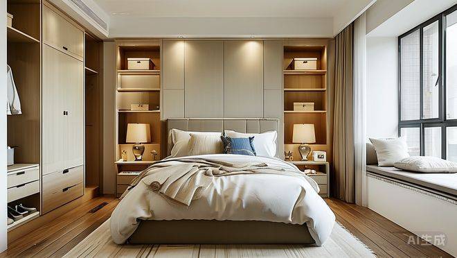 卧室作为休息的重要场所,同样经过了精心设计。主卧自带独立卫生间和衣帽间,充分保障了主人的私密性和生活便利性。次卧和儿童房也都尺寸适中,摆放床铺后仍有较大的活动空间。每个卧室都设有飘窗,增加了室内的使用面积,同时也为房间增添了一份浪漫的气息。此外,全屋还配备了多个收纳柜体,包括玄关处的鞋柜、走廊的储物柜以及各个房间内的衣柜等,这些精细化的收纳体系让家居生活更加井然有序,避免了杂物堆积带来的凌乱感。