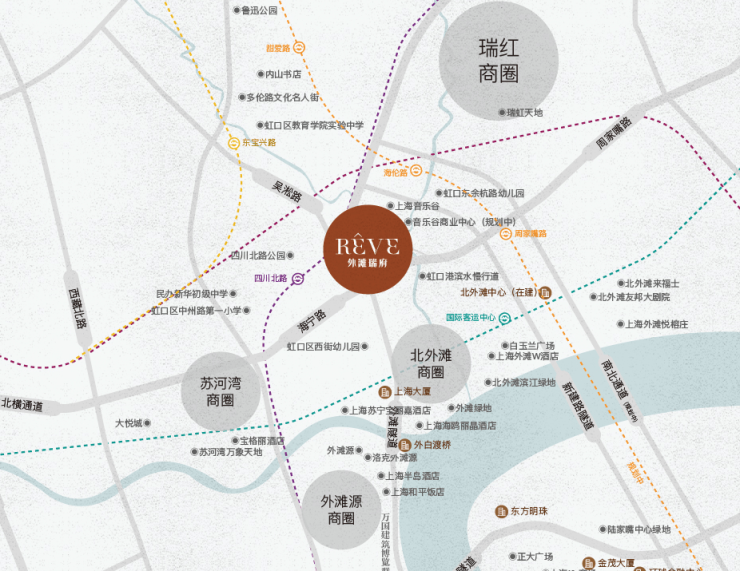 商业:外滩南京东路、瑞虹天地太阳宫、白玉兰广场、四川北路商圈环伺