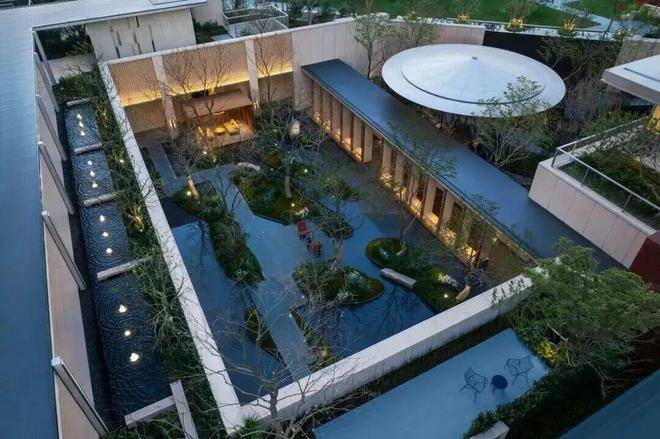 约6米高水幕的下沉式山水庭院,灵动的流水,层次丰富的空间,在自然松弛的氛围中,增添了一丝活泼的趣味。