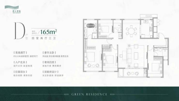 建面约165㎡4房为社区内的大户型,主要位于本次推出的楼王位置,四开间朝南、南向双套房,主卫竟然还是双台盆设计,妥妥豪宅配置。
