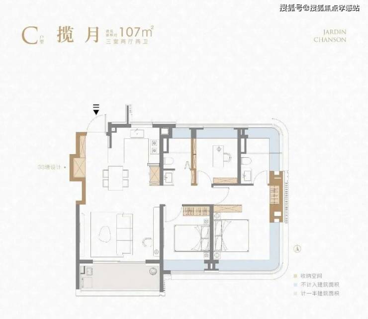不到90㎡的建面实现3房一步到位,功能性上符合市场需求!同时利用科学的收纳和S墙设计保障了室内空间的井井有条,又通过大量飘窗和阳台等提升尺度感,尤其是厨房带飘窗你见过吗?②建面约107㎡3房2厅2卫户型:
