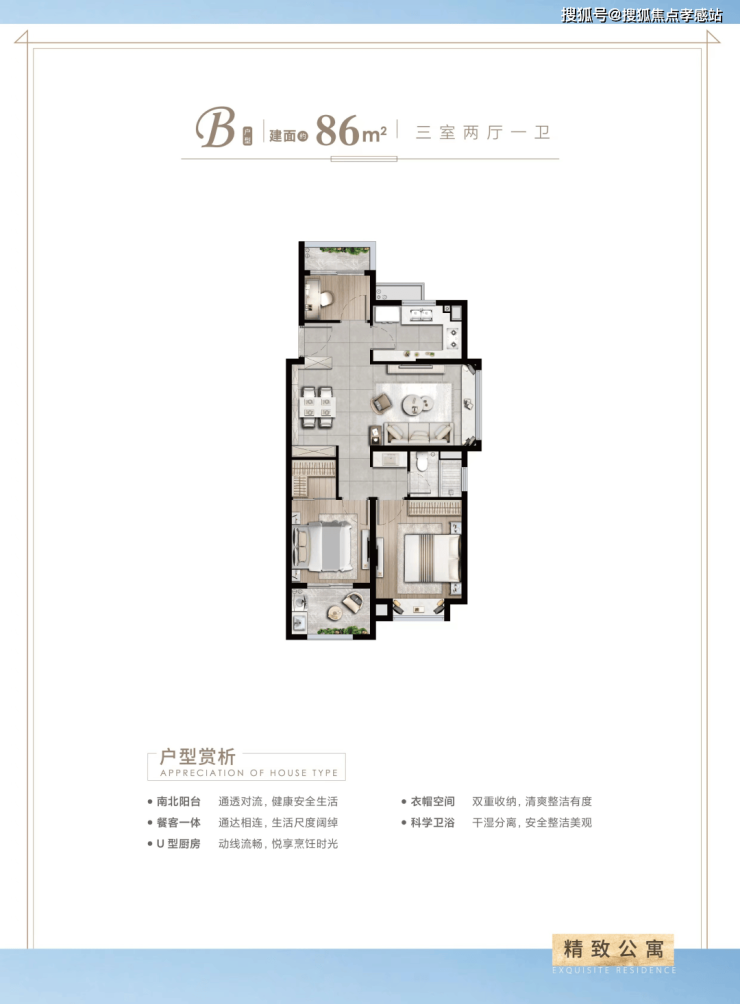 建面约86㎡3房2厅1卫户型特点:做到了双开间朝南+双阳台设计+卫生间干湿分离,一个非常紧凑的小3房户型。
