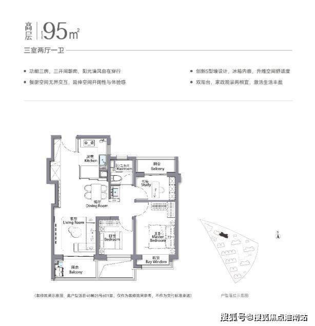 建面约95㎡高层,全系方正户型,双阳台设计,LDKB一体化设计,贯通动区轴线,打造温馨的家庭生活聚餐;