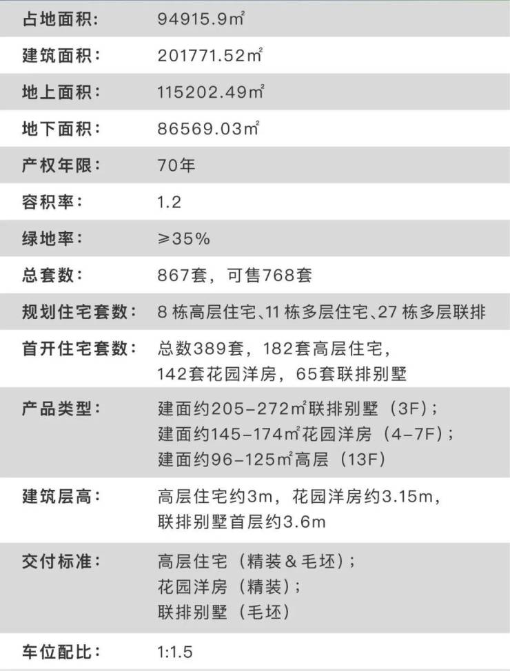 项目产品为建面约96-125m²高层住宅,建面约145-174m²花园洋房,建面约213-270m²联排别墅。