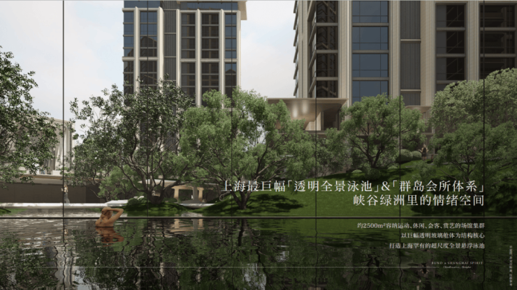 穿过园林,上海最大的约3500㎡下沉水院构成社区的核心灵魂,约13米的高差形成独特的“峡谷绿洲”,将黄浦江的水意象引入社区,中央平静水面与四周的会客舱、茶室、游泳馆形成呼应。