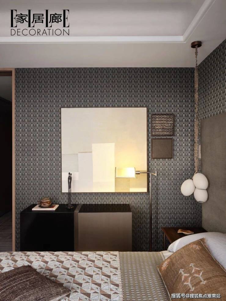 此外,空间中也尝试了基于材料的更多设计演化。父母房的吊灯同为特别定制,灯线采用皮革进行包裹,通过工艺的价值感深化作为长者空间的稳重气质。同时,为了弱化墙面较为密集的纹理对视觉的干扰,团队利用不同体块和肌理的艺术画作、艺术纸对墙面进行视觉转移。
