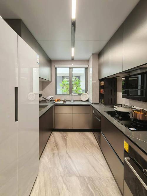 客餐厅厨一体化,U型厨房设计。标配厨房七件套,包括:洗碗机+侧吸油烟机+燃气灶+蒸烤一体机、线性凉霸、末端净水、双开门冰箱!连调味品收纳架也是交付的,完全可以实现拎包入住!