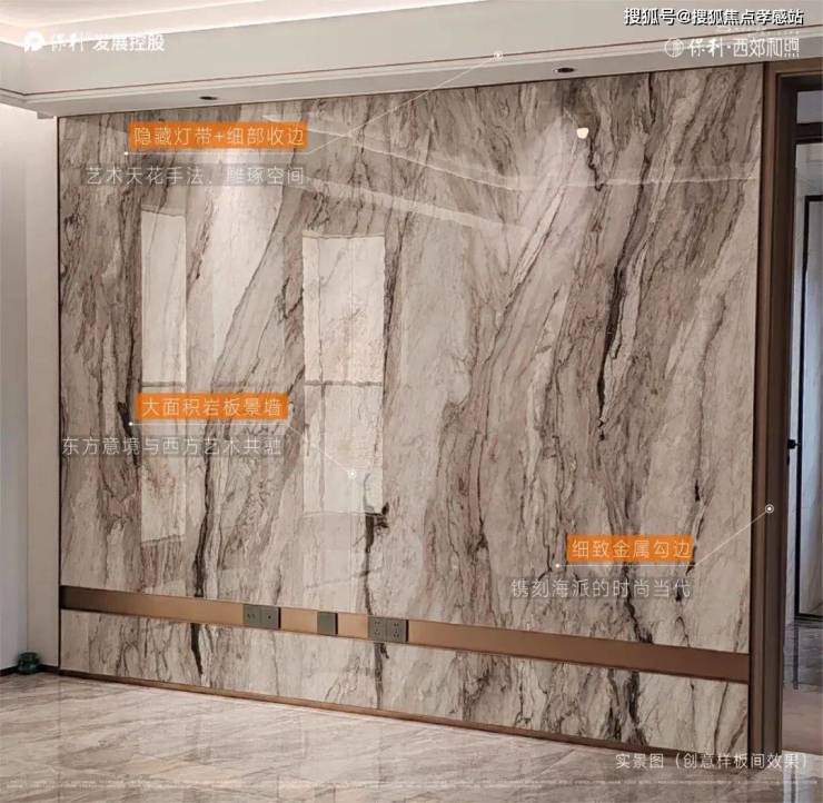 全墙纸交标结合整幅岩板客厅景墙,以定制设计感提升空间立体感。