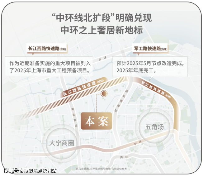 招商序占位内中环黄金节点,依托逸仙路高架构建「三横三纵」交通矩阵:北向衔接郊环,南抵内环核心,与南北高架、中环线立体互通。这一配置使其成为链接五角场、大宁、北外滩的枢纽,形成高效通勤网络。