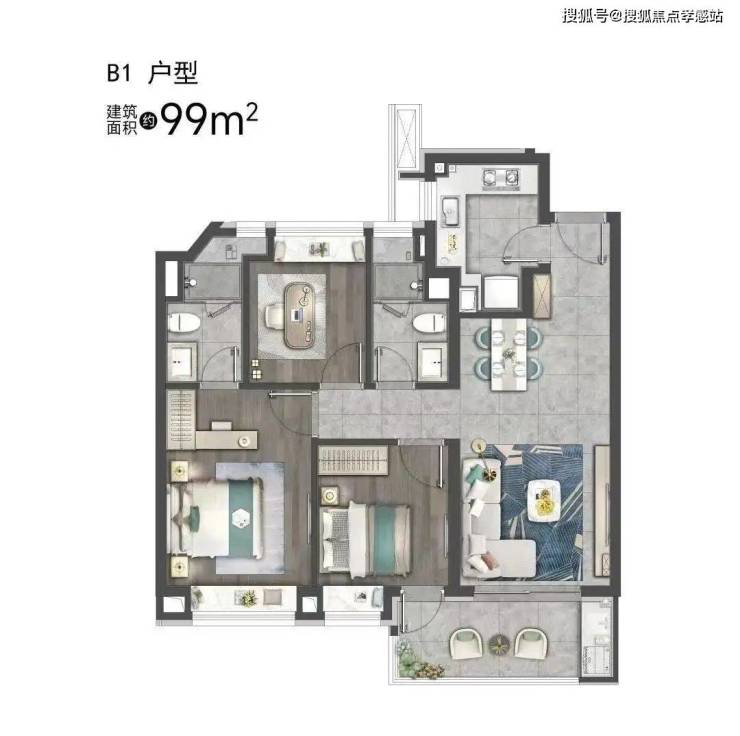 建面约105㎡为5.1米宽厅设计外接大阳台,这对黄金组合一方面撑开户内尺度,另一方面也让通风和采光俱佳。