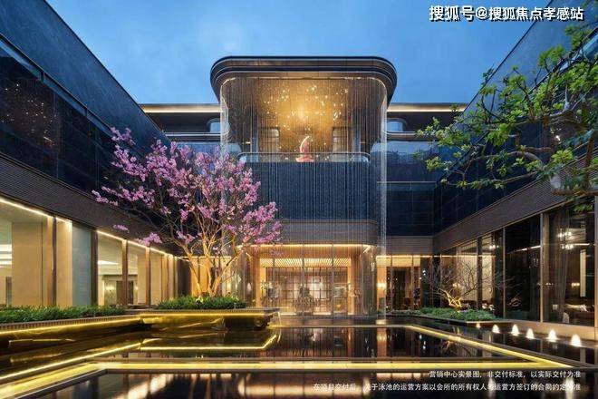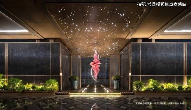 下沉式环幕庭院,跌水景观环绕,池底仿黑金砂与宝石晶片闪烁,点缀百余灯珠,师法“琉璃水光” 形意,糅合视听五感,打造全浸式立体园境,天工巧夺,嘉定未见。