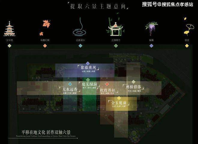建筑们围合出的中心花园中,州桥老街、秋霞圃、远香湖、古猗园、紫藤园、银杏古树等嘉定6景被南山地产提炼、转译,形成了具有在地文化特色的6大景观主题空间。