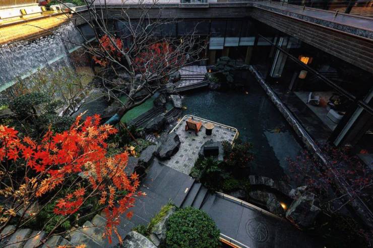 巧妙利用地块天然的高差,一座气势沉静的超长瀑布应运而生,水流声将城市的喧嚣温柔隔绝,营造出穿行于都市幽谷般的沉浸感。