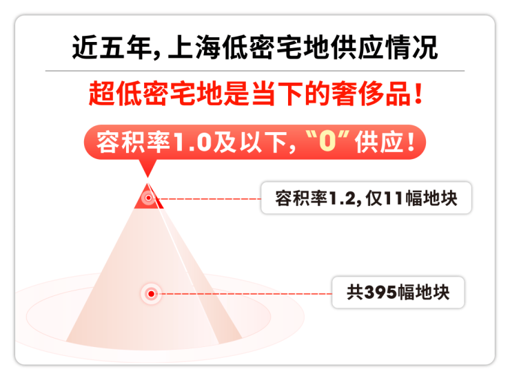 据统计,近5年,上海共出让 395 块宅地,其中,容积率在约1.2以下可以用作开发低密宅地仅有11副。而容积率1.0及以下 的地块,供应居然为“ 零 ”!