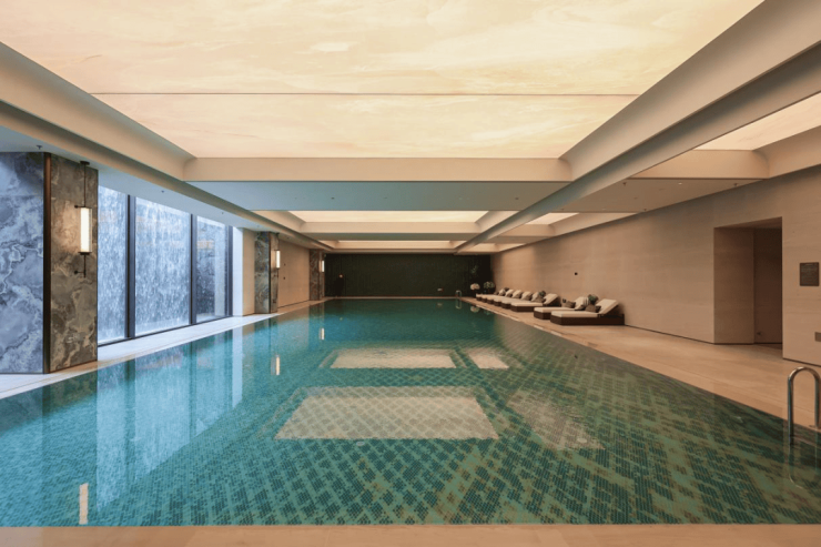 恒温泳池池壁,由工匠手工完成每一片菱形的精准铺贴。当水流轻抚过奢石景墙与温润的烤漆面,光影便在此交织流转,构筑出一个静谧而极具质感的沉浸世界。