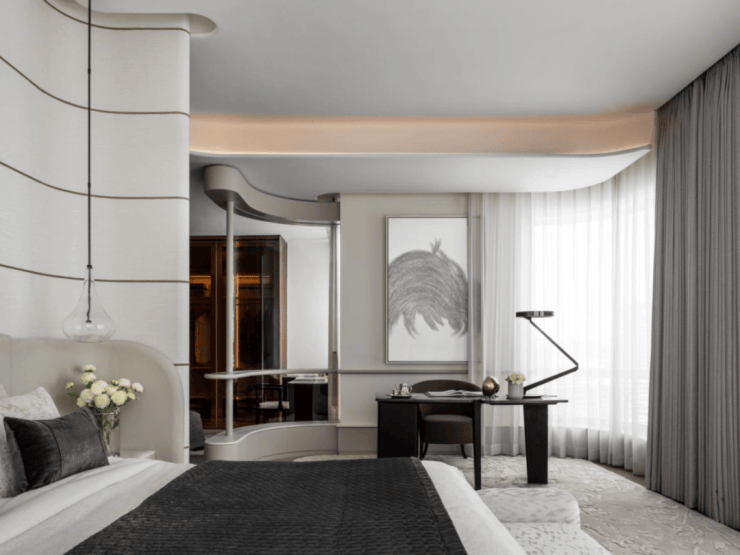 客厅空间采用大量造价昂贵的弧面设计,带来更有格调的审美价值: