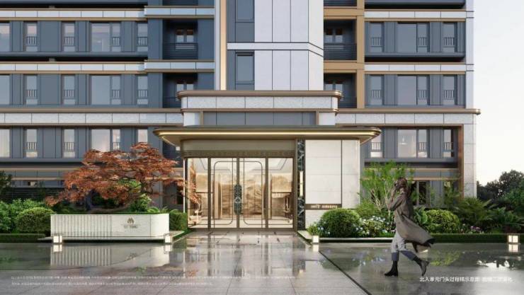 约70米超大尺度酒店式门庭,光这个大门就运用了仿铜色铝板、奢石、仿铜色金属网、贝金米黄石材等众多昂贵材料