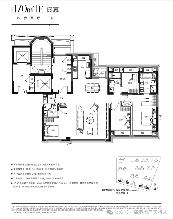 4房3卫,类一梯一户设计,不仅私密性好,安全性高,出行方便,还能大幅度提高业主享有的公区空间。三个卧室+超大横厅朝南,南向15.6米左右面宽,尽览首排公园视野,双套房设计,让170㎡的空间,装得下四代人的欢声笑语,却装不满生活的可能性——这才是真正的传世之宅!