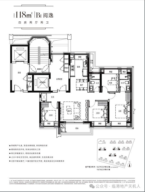建面118㎡四房两厅两卫户型整体采用的罕见的全屋6飘窗+无连廊南北通+四开间朝南+类一梯一户设计。单凭这三点,已经超越临港绝大多数如今的产品!