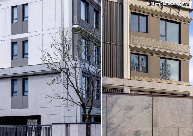 整体外立面以浅色香槟铝板线条、深色香槟铝板窗套搭配暖灰色真石漆,配色更具活力。