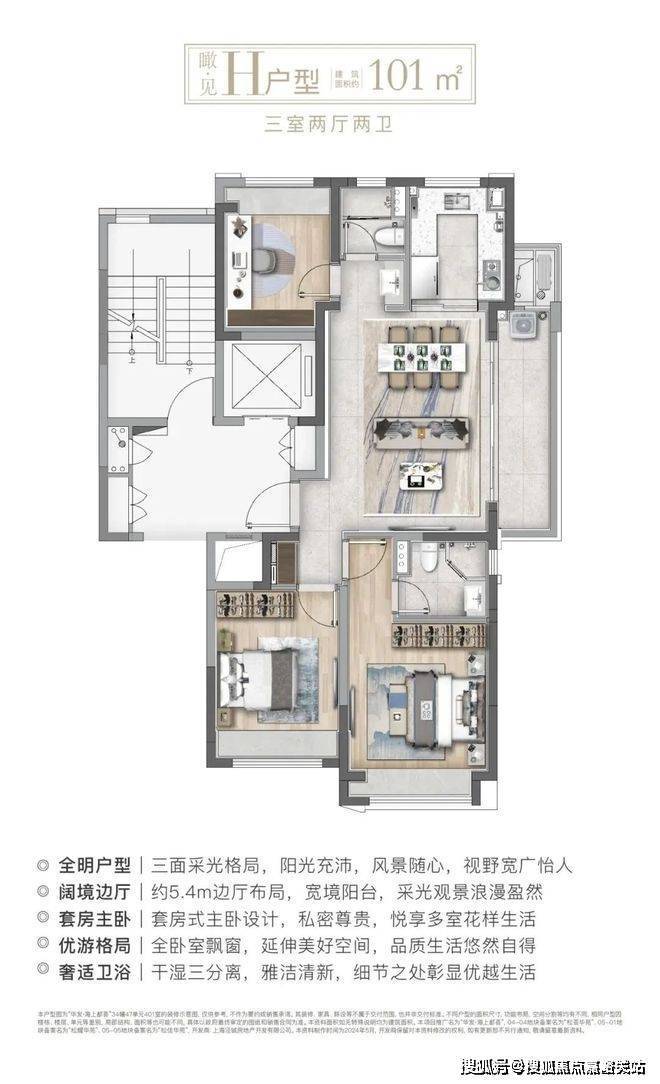 建面约101㎡H户型:三面采光,全能景观王炸边厅户型!同样是3房2卫的配置,功能性与舒适度兼具.该户型惊艳的地方在于大尺度的景观边厅设计,搭配超大阳台,营造IMAX级别的客厅景观面,极具阔绰感!全卧室飘窗、干湿三分离、U字型厨房设计,同样的魔鬼细节!