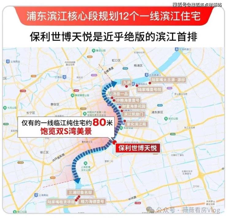 ①保利世博天悦是近乎绝版的滨江首排,直线距离黄浦江只有约80米,与江几乎“触手可及”