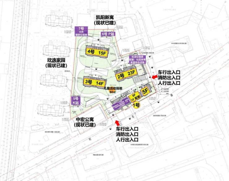 2号楼23层高层,3号楼14层,4号楼15层,2号楼的东北角是生活垃圾房,社区体育配套,食堂综合设施。