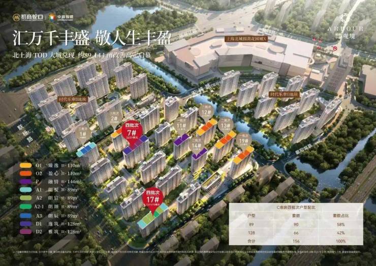 招商中旅·观境✅✅售楼处电话:400 - 1010 - 064✅✅加推89-128㎡3房,过会均价47466元/㎡,共计156套,前期建面约110-144㎡少量房源在售。