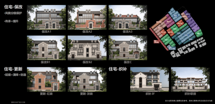 整体设计通过保留改造、更新改建、织补新建三大更新手法,10种建筑立面风格,在保留历史原真性的同时,实现现代居住体验的全面升级。