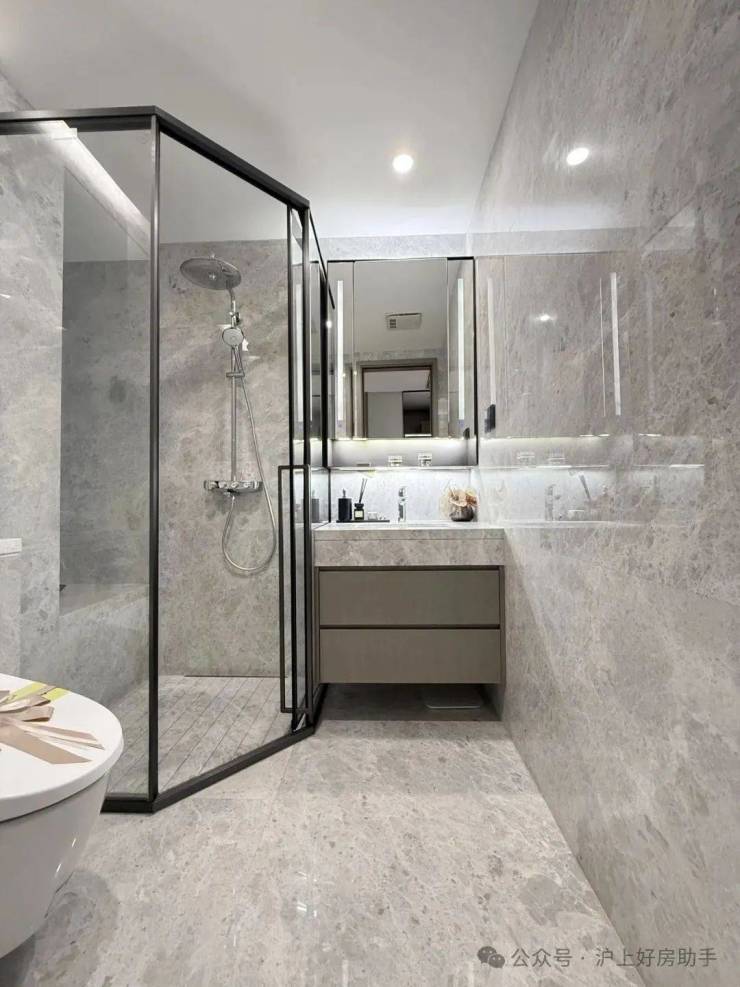 所有户型全屋墙纸交付,连电视机背景墙岩板以及主卧背景墙都是交付标准,卫生间甄选不同的石材,以此来满足功能区的需求。
