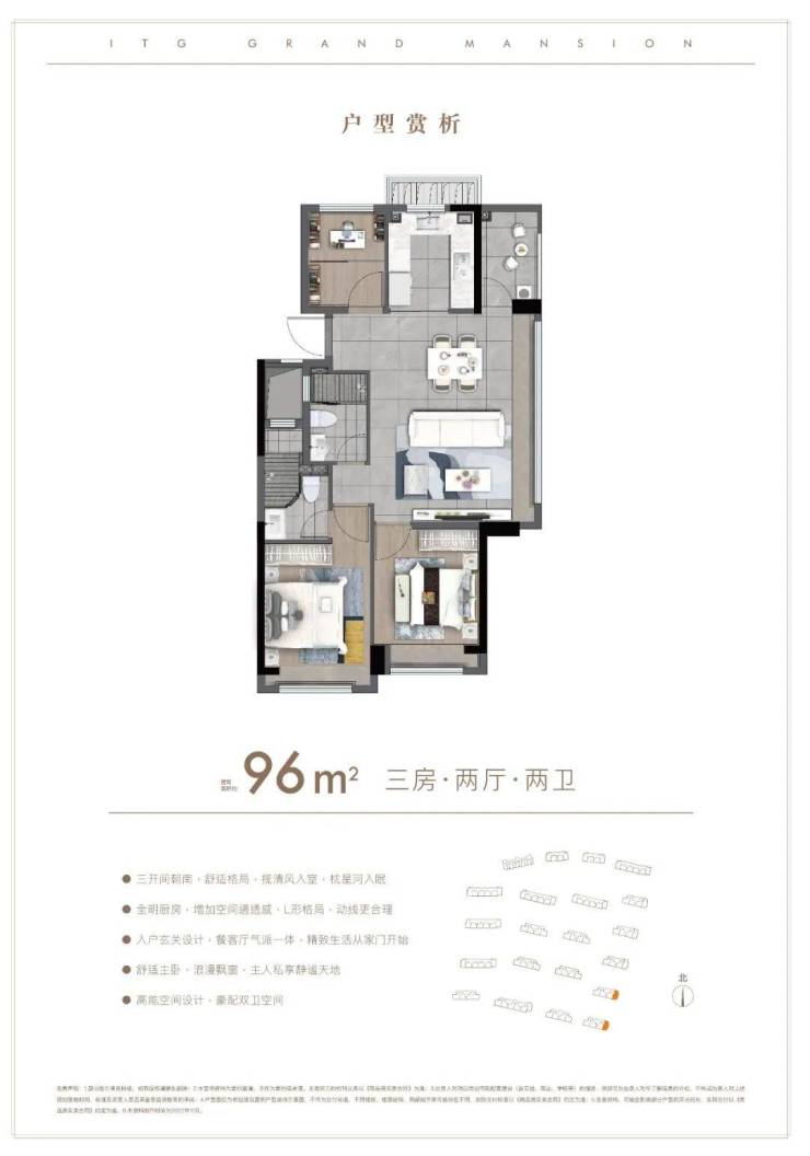 户型方面:约85-96㎡的全三房设计,每一款户型都是会传递出国贸的产品观。南北通透,布局考究,动静分离。