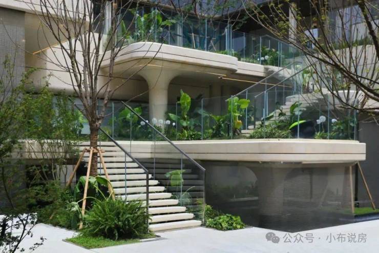 点睛之笔在于 4层悬浮式阶梯, 设计理念据说来自全球十二大奢华酒店之一的 迪拜丽晶公寓, 每一个观景露台都种植着不同的植被,一步一景, 更重要的是,不同的露台对应着不同的观景视野点,将不同高度的下沉式庭院景观,通过极其优雅的方式传递给了业主。 这个归家体验可以说是拉满了!