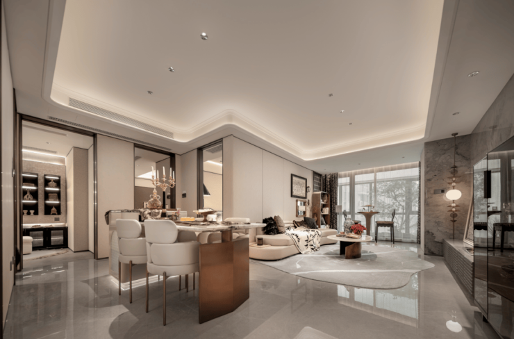 项目首层通过硬朗直线呼应柔和曲线勾勒,辅以温润石材与古铜色金属线条融合,打造东西方美学共融的艺术藏品
