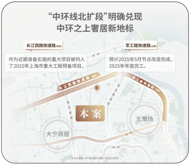 交通方面:项目紧邻长江西路地铁站(直线距离约150米),1站江杨南路,5站复旦,7站五角场。中环线北扩段明确兑现,军工路快速路25年开工,长江西路快速路列入上海市重大工程清单预备项目,快速链通城心,随着中环线北扩段的政策明确,淞南将正式进入中环时间。未来经逸仙高架,进入南北高架、内环高架、中环高架,可快速链通南北上海。