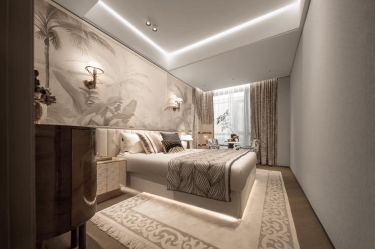 即便放了双人床、两个床头柜、一个收纳柜、两个休闲座椅和茶几,空间依旧绰绰有余,尺度感惊人!