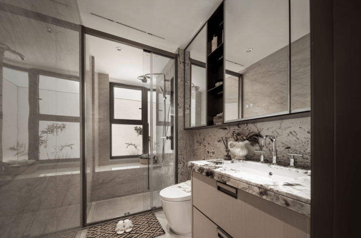 双轴线的设计,充分拓宽了视野面与观赏点位,环形回廊、精神游廊与下沉庭院通过立体景观平台相融,又创造出隔岸听泉的诗意场景。在每个重要生活触点,业主都能拥享独特景观和欣赏视野。