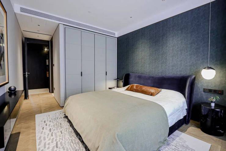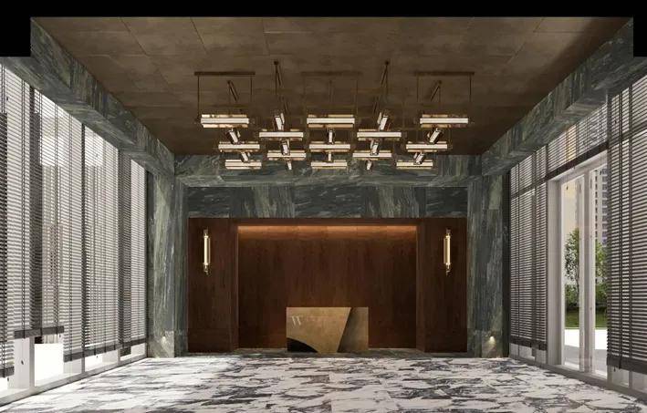 项目采用地上+地下三层同标准精装入户大堂,一楼大堂层高约6.6米,大堂选用有着媲美艺术品表现力的亚马逊绿天然奢石,结合仿古铜不锈钢、艺术壁灯为点缀,将上海的摩登气息注入归家大堂,给业主更强烈的入户仪式感。