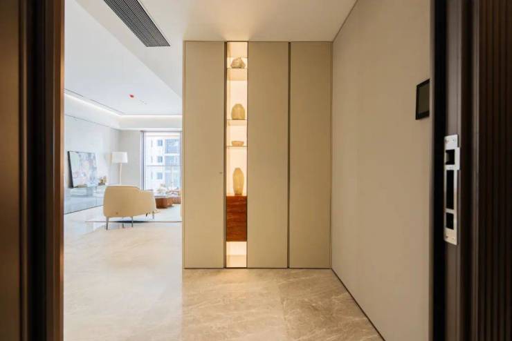 入户设置玄关,玄关处配置收纳空间,不仅提升了居者入户的仪式感与尊崇感,也让进出大门随手的物品有了大容量的储藏空间。