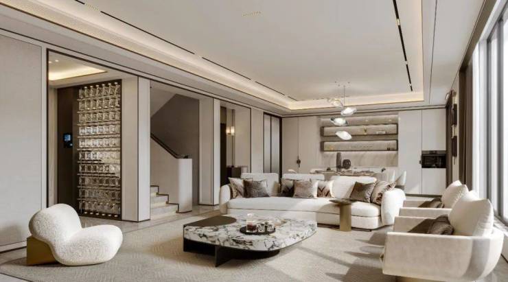 一层是会客区, 约10.7米的超大面宽 ,阳光、空气可以“肆意”穿过,室内通透明亮。