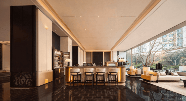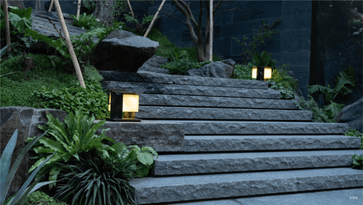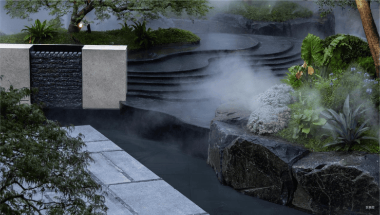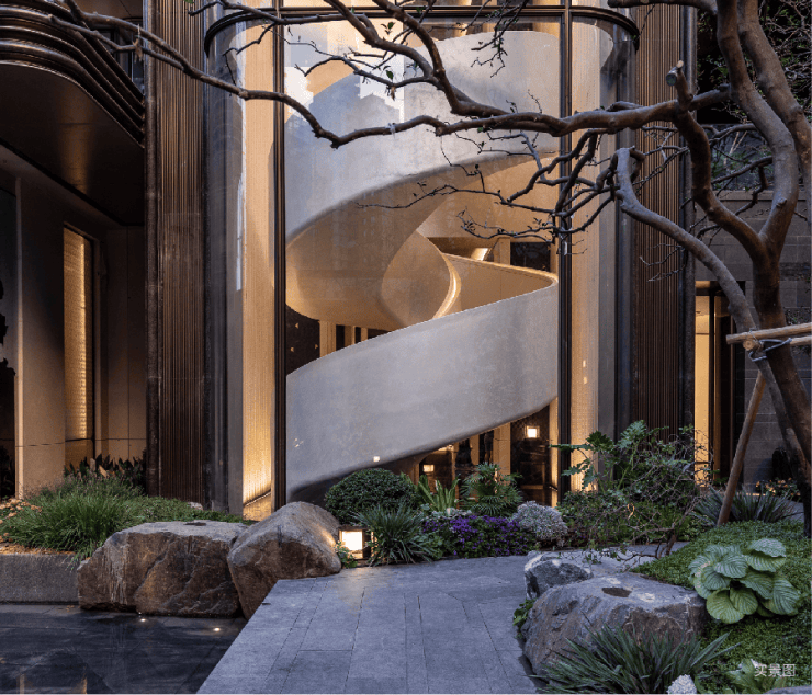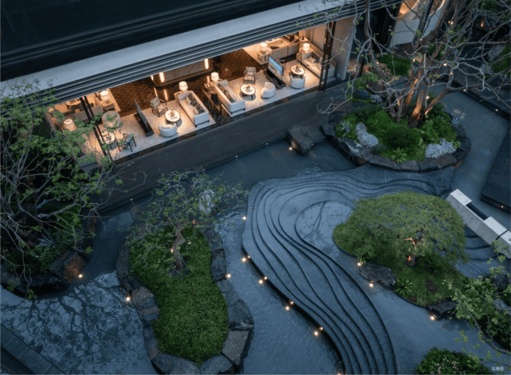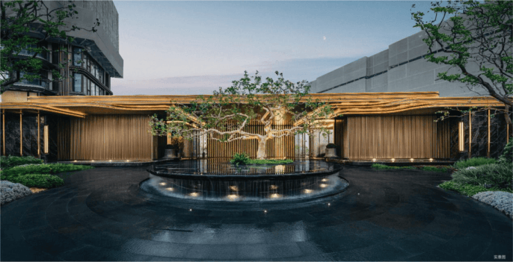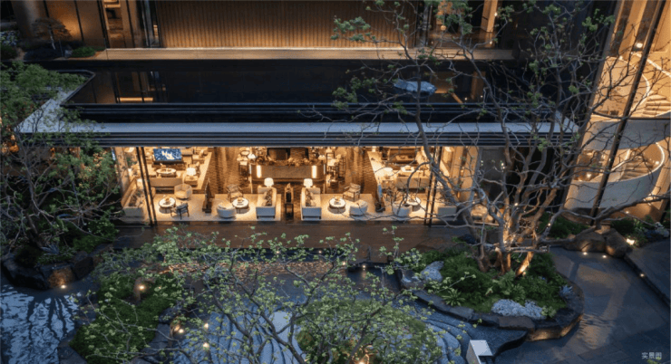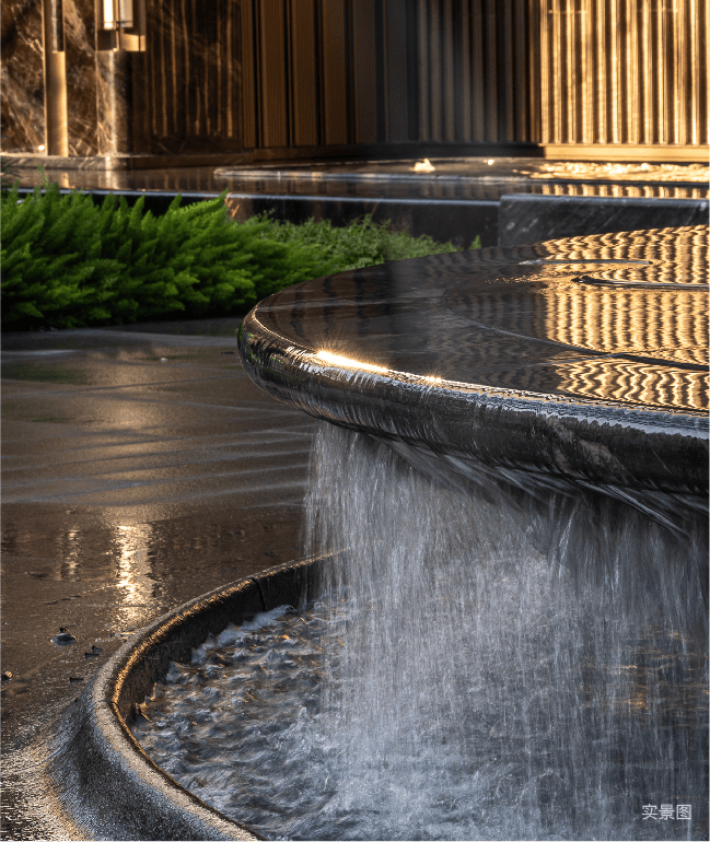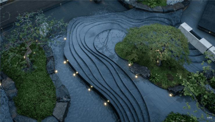 而实景首开的近2000㎡下沉庭院,作为“园林灵魂”,漫步此间,你会看见:乌金原石围合的“玉扣绿岛”上,低调静放着团队自“天下玉源”河南南阳历时遴选而来,近7000年的“国玉”独山璞玉,与山野林木共此氤氲灵气,尽显东方温润;从诗经走出来的近11m高参天乌桕,则再现古诗中所描述的“秋林城郭画图中,乌桕千株照眼红“的诗意;采用约6.7m幻影蓝奢石打造的“叠级水瀑”跌水台,池底以呈现天然墨绿色泽的蓝金刚石铺就,映水之澄明,境之悠远;连台阶都采用了“黑色花岗岩之王”安哥拉黑整石,沿云梯而上,让人返璞内心东方......