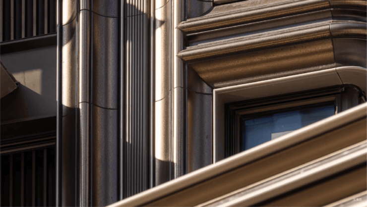门庭隐现墨绿色泽的「璞熠琉璃」背景墙,经800℃高温淬炼,三十昼夜退火降温,无数遍打磨抛光,光影流转间熠熠生辉;
