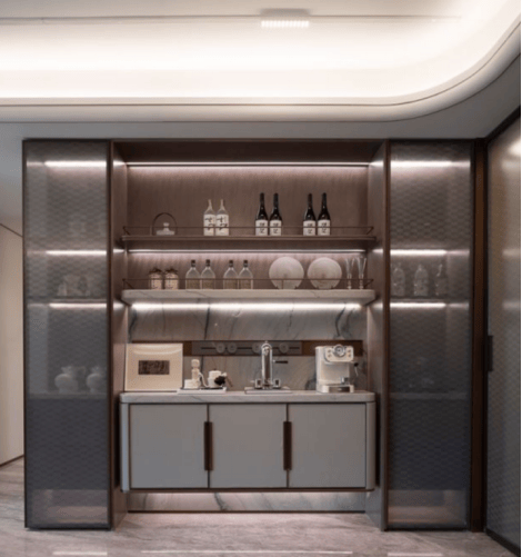 在交付配套之中高阶定制餐柜空间,提供更多收纳空间之外,也增加空间视觉层次。