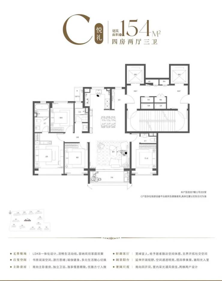 4房2厅3卫设计,整体格局方正,南北通透,四开间超14米奢阔尺度,阳光清风肆意流淌。约9.9米阔绰LDKB一体化空间,大尺度的竖厅设计,容纳多元家庭欢欣团聚。