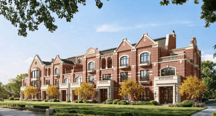 联排别墅采用英式维多利亚建筑风格,红砖与德国米黄干挂石材的搭配,形成温暖且经典的色调;经典长窗/方框窗/八角窗/拱形造型/坡屋面,赋予建筑精巧自然的美学质感。