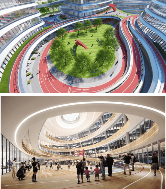 秉承“健康工作、万步联动”的设计理念,办公区每个楼层均设置了万步健步道,与安踏集团“永不止步”的品牌理念一脉相承,也寓意与社会各界各方联动互赢、连接全球资源共赴未来。