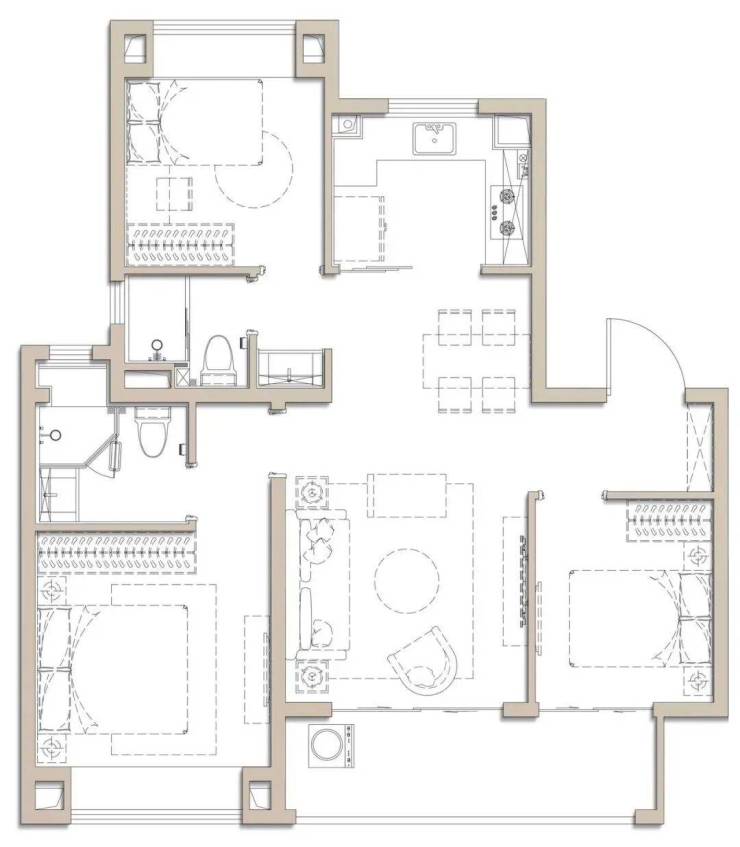 建面约100㎡是个典型的飞机户型,全明户型南北通透,独立玄关实用美观,几乎无过道浪费,延伸了空间的尺度。